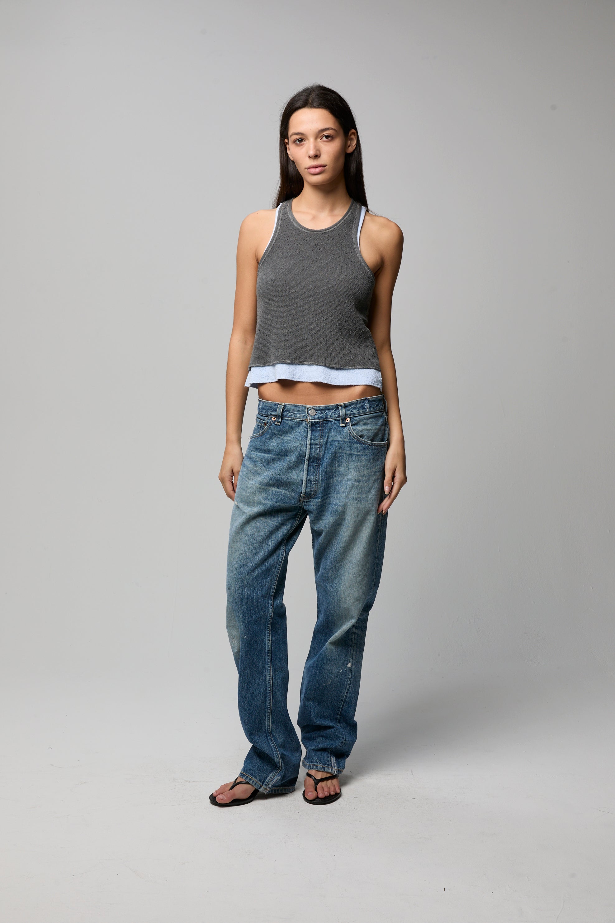 Textured, cozy, and made to live in. Cut from our cotton bouclé with subtle dimension and a naturally broken-in feel. A relaxed muscle silhouette with wide arm openings and an easy scoop neckline.