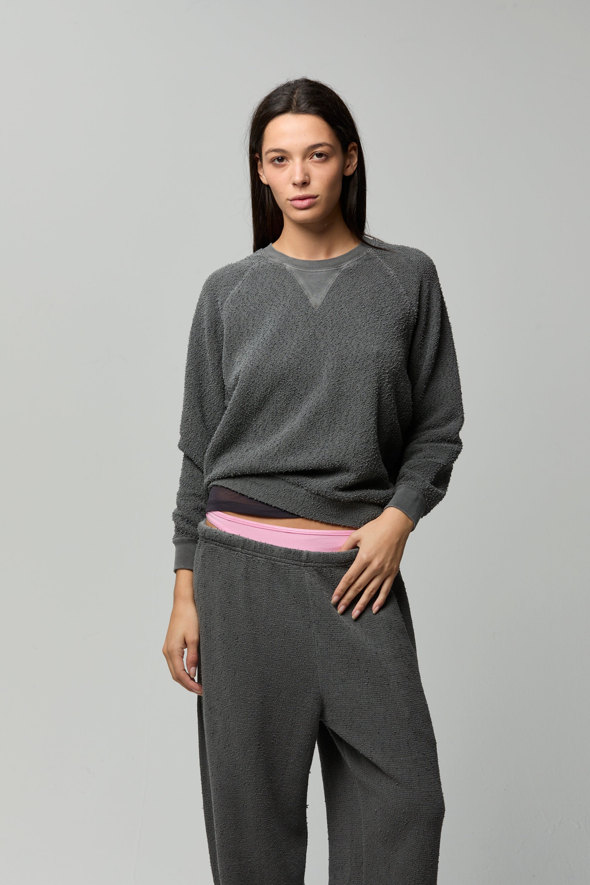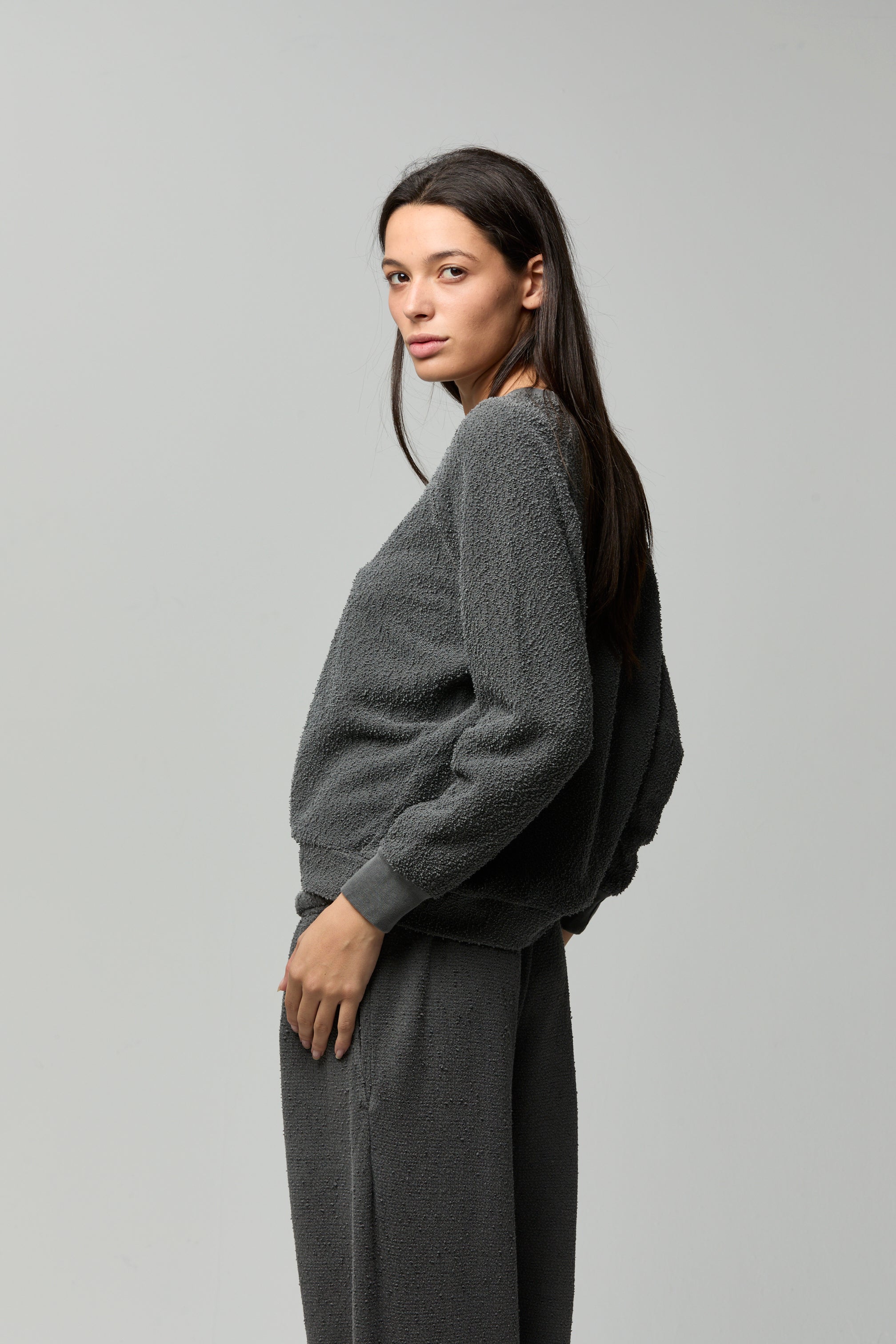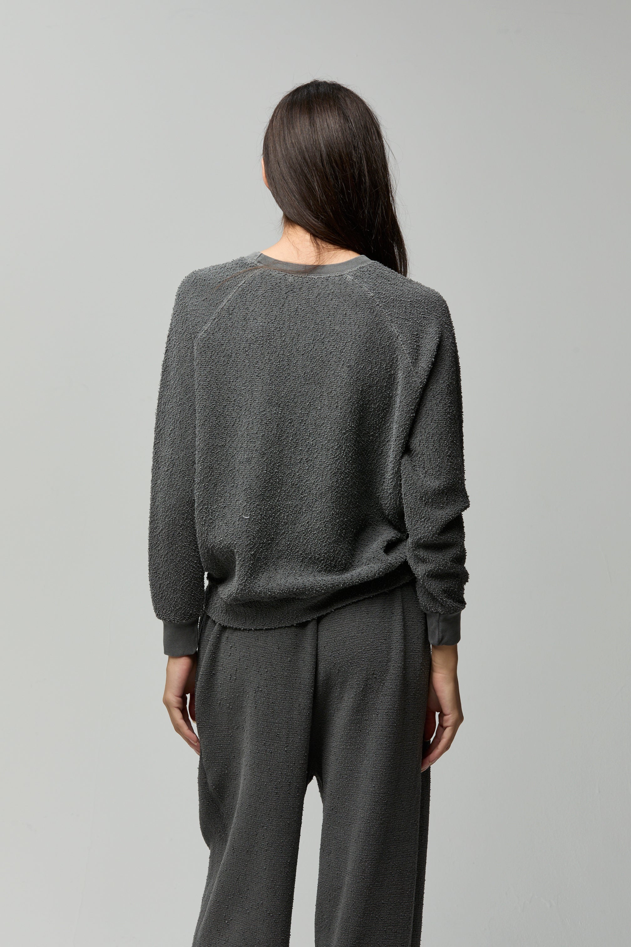 A classic raglan sweatshirt silhouette in textured cotton bouclé—soft, cozy, and effortlessly lived-in, with subtle structure for everyday wear.