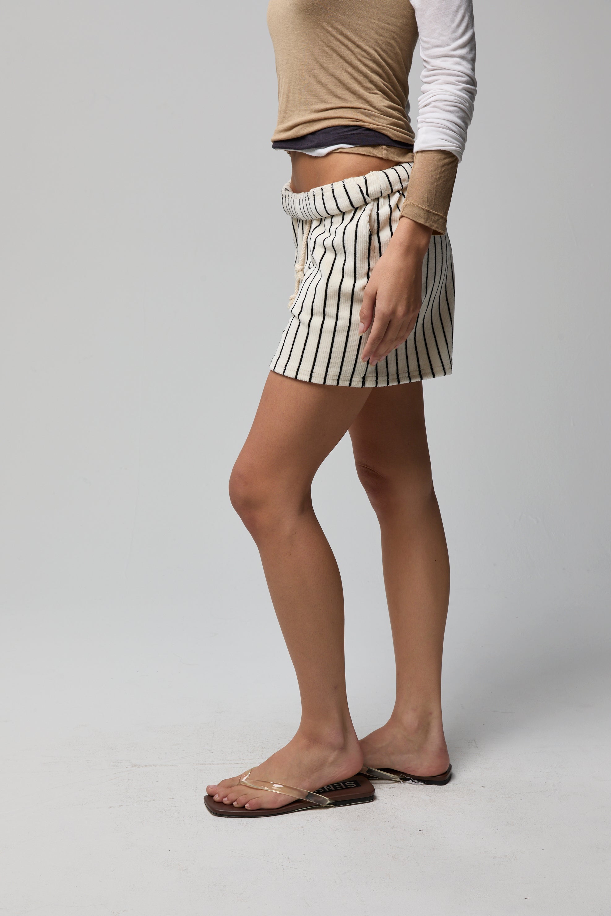 The short you pack first. Cut in plush cotton velour with a soft, structured hand, the Sandy Short delivers comfort without losing shape. The vertical stripe elongates the leg, while the elastic waistband with drawstring keeps the fit effortless and flattering.