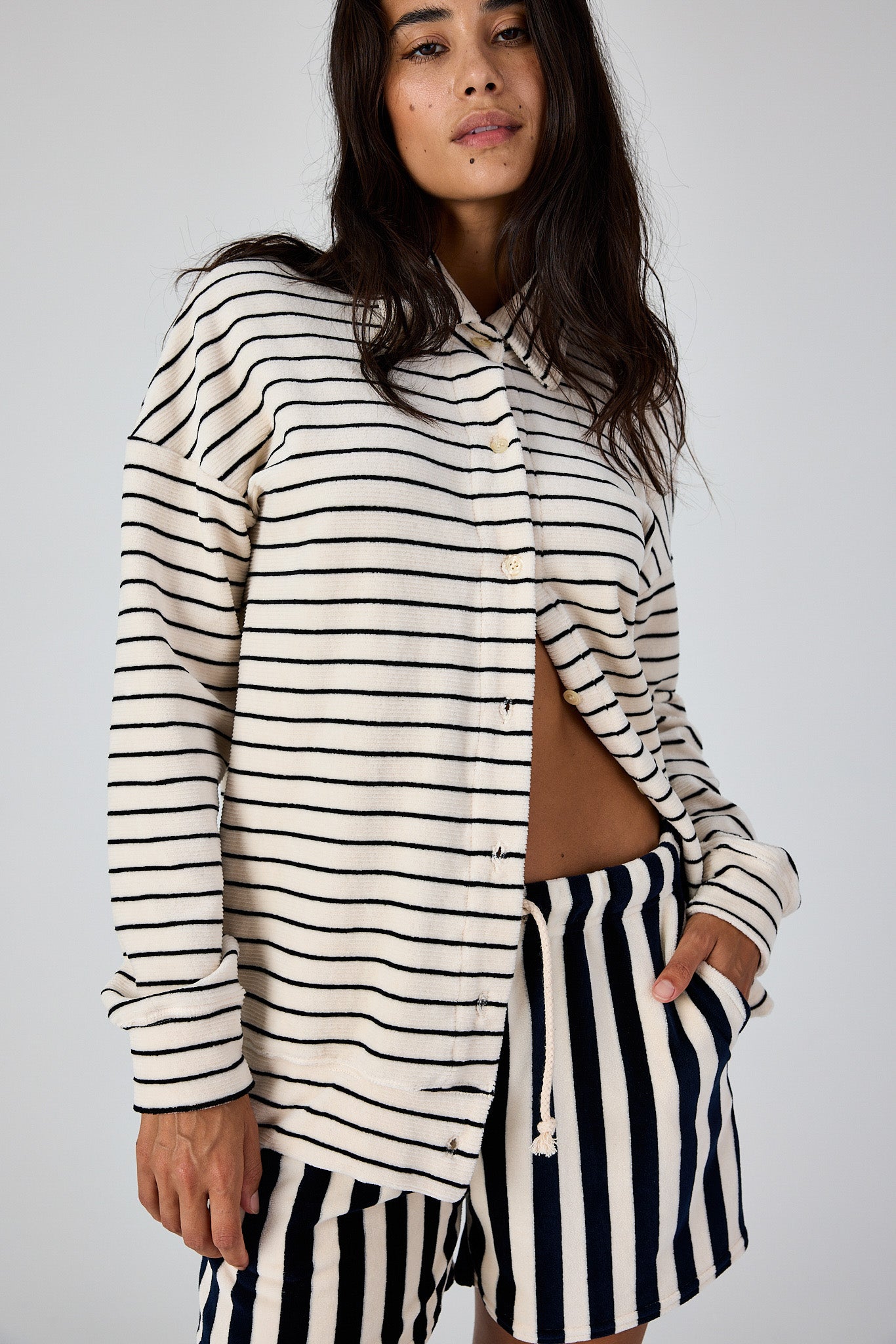 A modern take on the classic striped cardigan. Crafted in plush cotton velour with a smooth, light-catching finish, the Teri feels incredibly soft while holding its shape. The structured collar and clean button front give it definition, while the relaxed silhouette drapes without adding bulk.