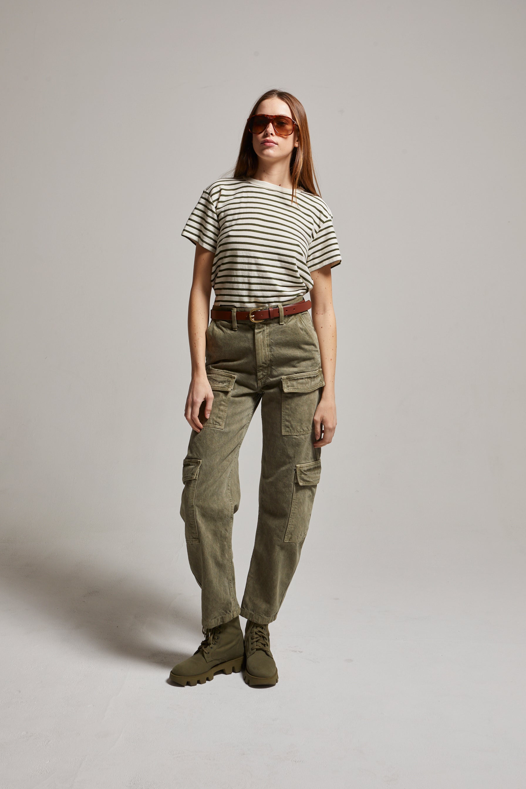 In a natural and green stripe, this version adds depth to your everyday tee lineup. Slightly boxy with a clean crewneck, it’s easy to dress up, tuck in, or wear loose.