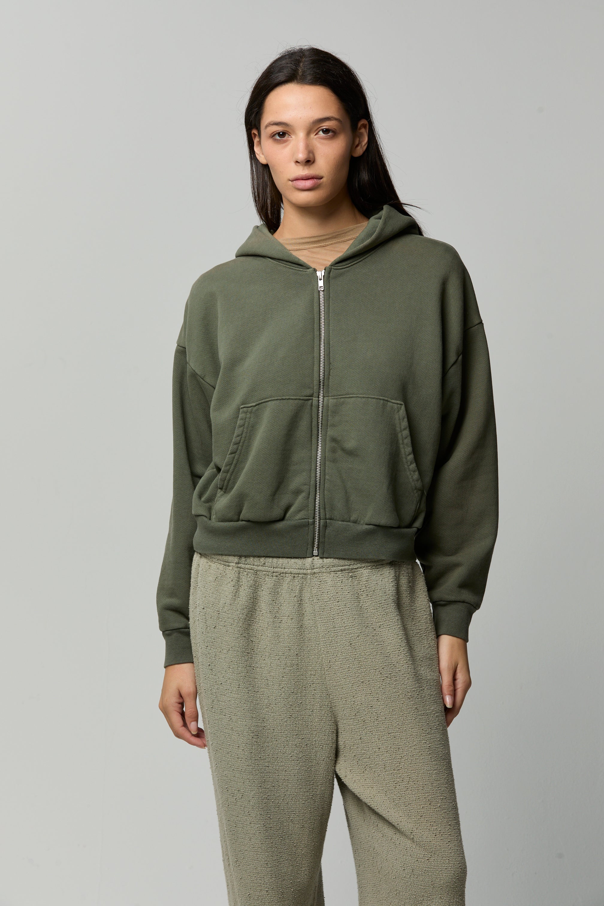 The Rosie Zip-Up is designed with a boxy, slightly cropped silhouette that hits at just the right spot — relaxed, effortless, and endlessly easy to style. Crafted from our signature vintage cotton fleece, it features that coveted high–low texture and a weight that feels luxe and grounded, almost like wrapping yourself in a light weighted blanket.