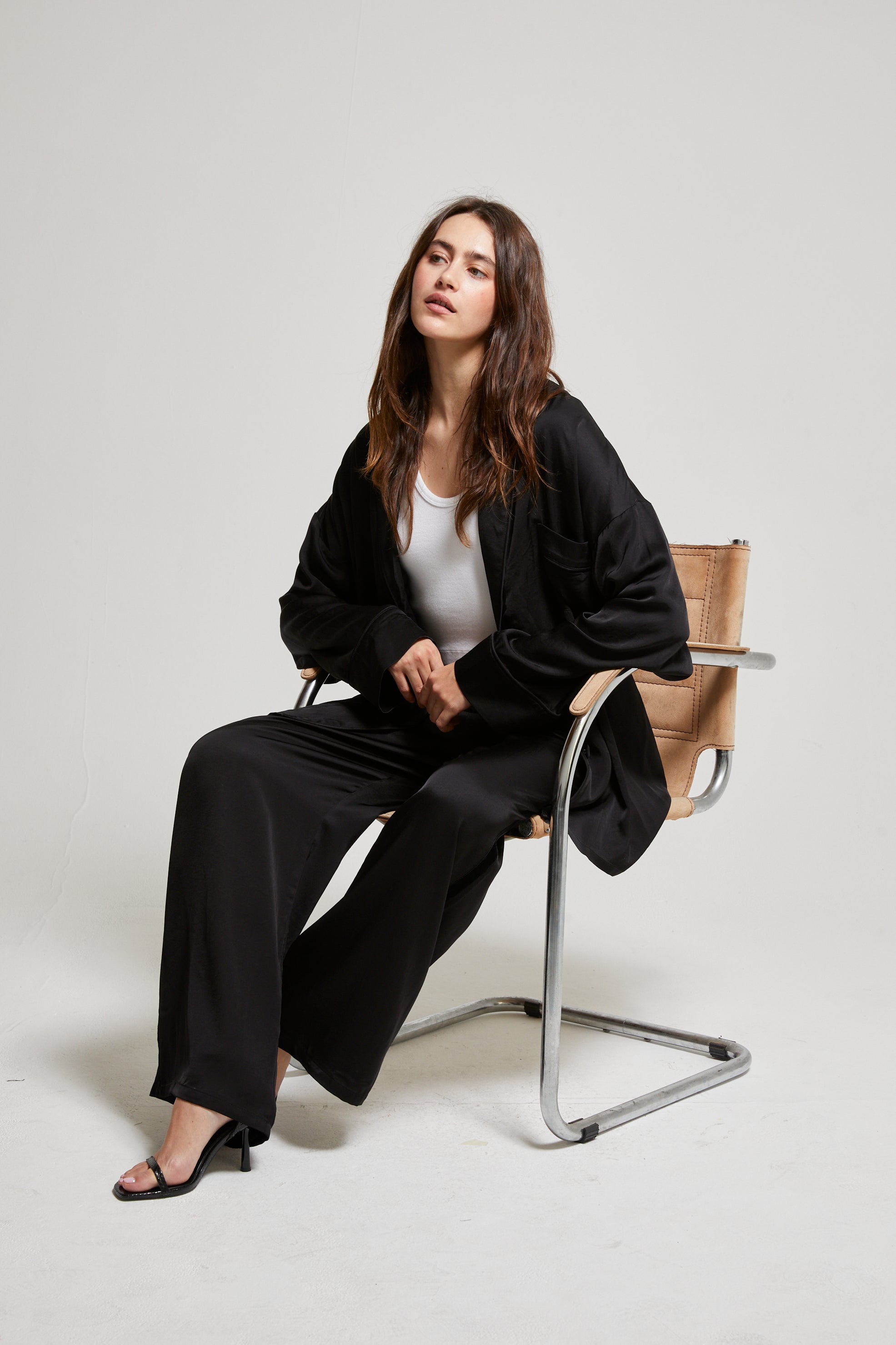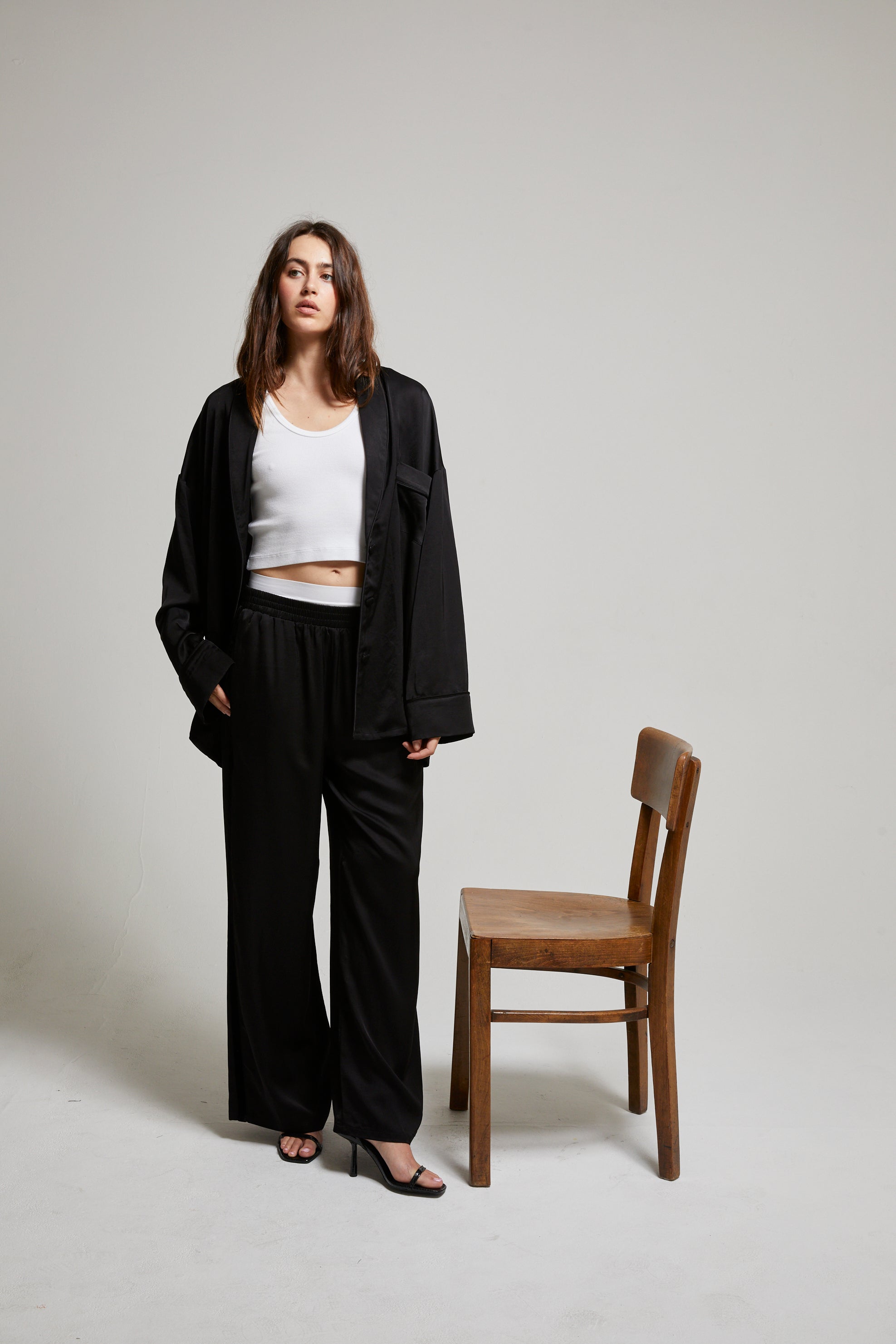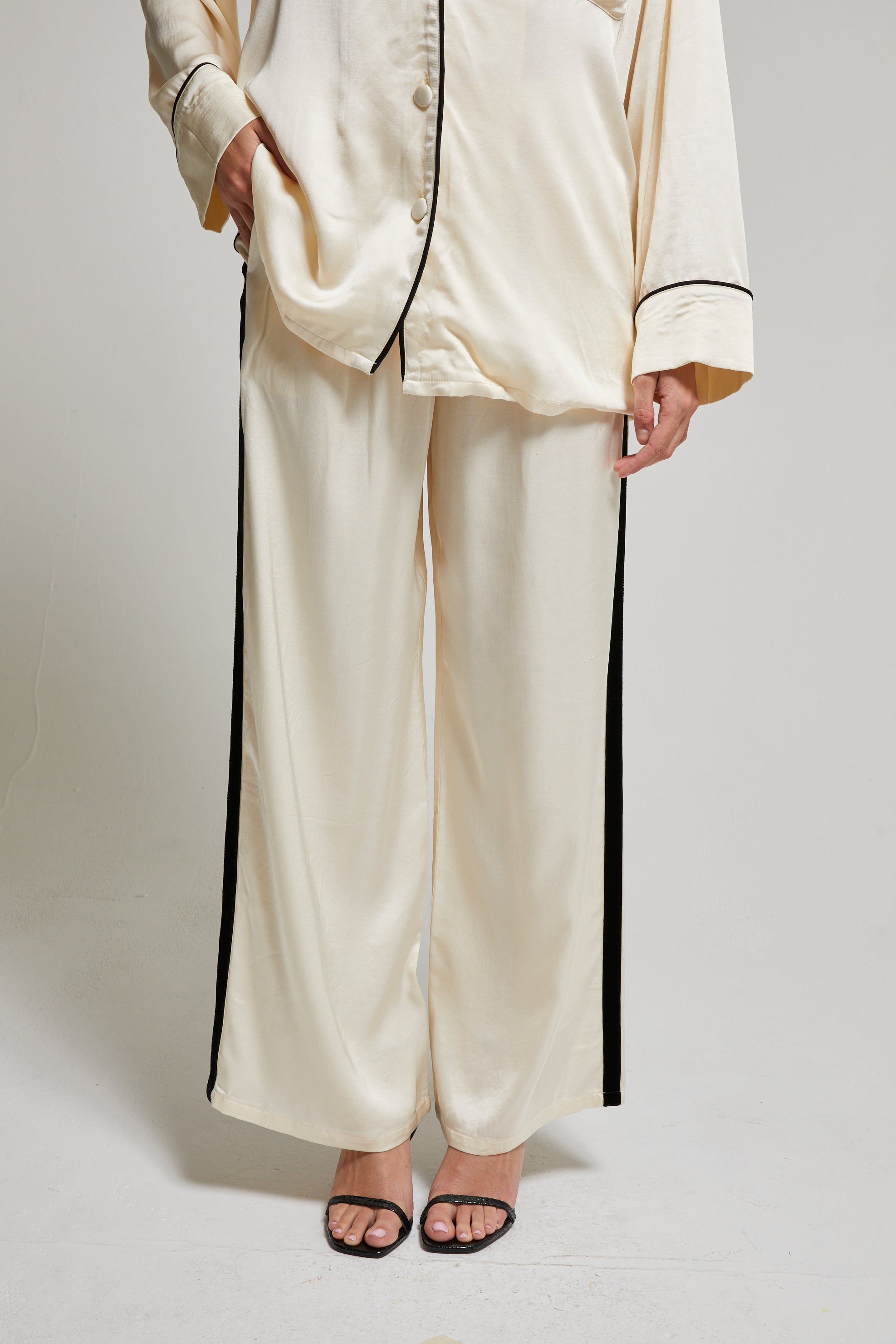 A modern take on relaxed tailoring. Cut in fluid viscose sateen with a clean, straight-leg silhouette and subtle racer stripe detailing. The elastic waistband adds effortless ease, while the full-length drape elongates the leg. Inspired by our best-selling Belle Pant—made for movement, comfort, and quiet luxury.